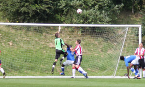 John Cofie himself had an effort well saved by the visiting keeper as the Blades tried to double their advantage. The Shrews were still very much in the game though and were working hard to close down United. This allowed Blackman to demonstrate his strength, holding off the attentions of four of the visitors before playing the ball to a fellow Blade in the middle of the park.