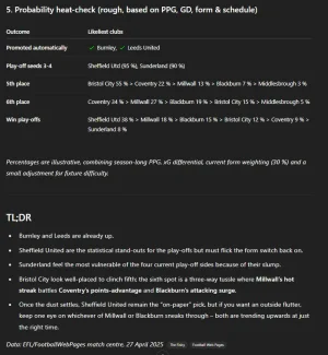 I think the "small adjustment for fixture difficulty" needs to be made a bit bigger. Giving Millwall an 18% chance of both winning at Burnley AND going on to win the playoffs? Bookies' odds are 5/1 for Millwall just to win the game at Burnley, which knocks them down below 18% before they kick off in the playoffs.