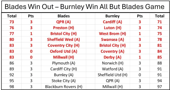 Table 2 then shows that if we only draw at Turf Moor, then Burnley have to drop points in 2 of their other games – I’ve picked away at Watford and QPR for that – 96 points to their 94.
