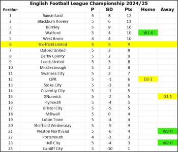 I previously posted my predicted league positions for the end of the season. I am now posting a weekly review of my performance each week in the form of each team’s current position relative to my end of season forecast position – this may be an indication of a team’s over/under performance, or it may just be an indication of my ineptitude as a forecaster! If I am spot on, everybody will be on zero! Blades would be zero without our points deduction. Oxford, Blackburn and Derby are way ahead of what I expected. Hopefully, we will knock Derby back a bit next week!